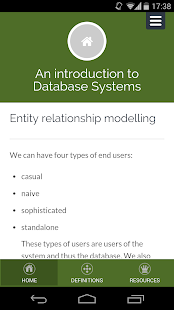 The app features articles on various database subjects, along with a definition area and resources to test your knowledge on database systems.